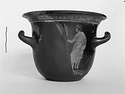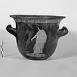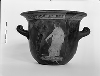 | Description: | Nearly the complete circle of the rim preserved, but the base, much of the walls and one handle missing. Restored in plaster. Dotted egg pattern below rim and as lower border. Obverse: youth, cloaked and wreathed, holding a laurel branch in his right hand (Apollo?), faces left towards a draped female figure (small part of shoulder drapery only preserved). Reverse: single cloaked youth, left. No relief contours. Glaze red to black. | |