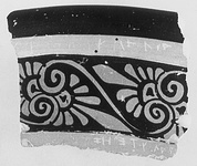 | Description: | Fragment from rim of a large krater decorated with a slanting palmette band. Letters lightly scratched in reserved bands above and below band of palmettes: <graphic> <graphic> | |