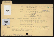 | Description: | Under surface left unfinished from the wheel; sides nearly straight, flaring at the top; wide vertical band handles. Pink clay; unglazed. Miniature Votive Kantharos. 700 others, identical with this in shape and proportions, were found complete in this cistern, together with fragments of 700 more. | |