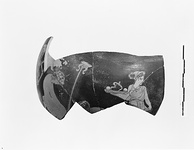 | Description: | Fragment from wall, mended from six pieces, preserving about half the circumference of the body, with parts of five figures. Egg and dot border below figures; start of curve to neck at top of fragment. Thin brown wash irregularly inside. From left: draped standing figure, one foot on a stool or small chest, leaning forward, left arm resting on knee, right hand outstretched, holding an untied olive(?) wreath. A single small ball on top of the chest. Nude youth, standing facing, looking three-quarters left, playing a lyre. Nude youth seated on a stool, on drapery, right, head and shoulders bent, both hands on his knees. Facing him, part of head and shoulders of a fourth youth, kneeling or bending down. Between the seated and the kneeling figure a tall candelabrum. At the extreme right, a female figure wearing chiton, broad head band, necklace and bracelet, standing turned slightly left but looking back right, carrying a tray of fruits in her hand (bunch of grapes and two apples?) and holding the edge of her overfold with her left. Trace of something else beyond her. The youths wear ivy wreaths with added clay berries. Added clay also for ball on box, berries of untied wreath, keys of lyre, necklace, bracelet and fruits. For the bunch of grapes dots of clay have been added unter the glaze. Drapery folds freely picked out with dilute glaze; the curly hair runs to brown. Rather thin black glaze, dull and somewhat peeled, especially in the drawing of the seated figures. | |