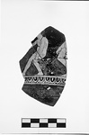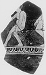| Description: | Fragment of wall; good dull black glaze inside; egg and dot pattern below figures. One small piece of lower border does not join. Parts of two nude male figures, standing left. Figure at left preserved save for upper front part of head and face, lower right arm and front part of right foot. He stands as if about to jump, his right arm extended, the weight on the left foot, drawn back. In his left hand, hanging at his side, is a bag-like bundle of thongs (cf. BMC, III, pl. III, E 63). The figure at the right (lower front part only preserved) stands in a resting pose, weight on left leg, right knee sharply bent. Coarse relief contours. Glaze mottled ret to black. | |