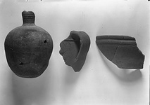 | Description: | Handle and part of lip broken away. Shallow grooves around shoulder and above base. Coarse red clay. | |