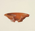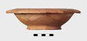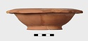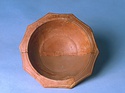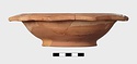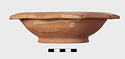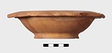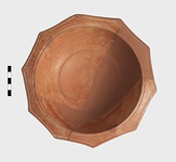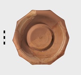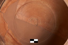 | Description: | Mended from several pieces. Rather more than half preserved. Open bowl with low ring foot; rim round at inner edge, polygonal at outer. At center of floor, a swastika in a square with a circle round about. Red clay. Pale orange-red glaze. | |