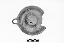 | Description: | Fragment of rim, opposite the preserved handle, missing. Plain saucer on flat bottom left rough. Horizontal band handle smeared on at rim. Pinkish buff clay, handle glazed and two bands of dull red to black glaze on inside. Burned. | |