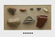 | Description: | Fragment preserving part of a sharply concave rim set at an angle to wall. Horizontal handle, round in section, rising vertically from the rim. Light gray clay; scanty remains of darker wash. | |