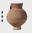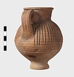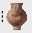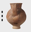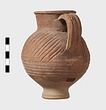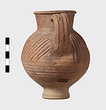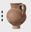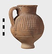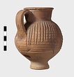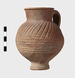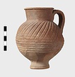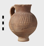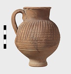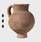 | Description: | Intact. High small ring foot; plump body; high round mouth; slightly projecting lip; single ridged handle. Diagonal gouging on upper half of body. Pinkish-buff clay. Dull red to black wash on neck and upper body. Three other whole ones, similar but slightly larger [H. 0.165 - 0.17] not catalogued. | |
