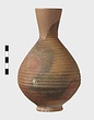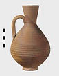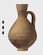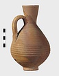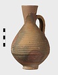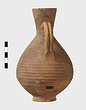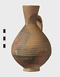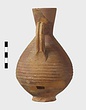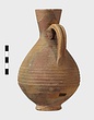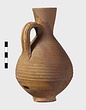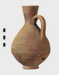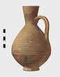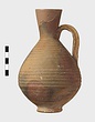 | Description: | Fragment of neck and most of lip missing; otherwise unbroken. Restored in plaster. Small ring foot; pear-shaped body narrowing sharply; tall neck slightly flaring, grooved below plain lip; ridged handle from bottom of neck to shoulder. Wheel ribs around upper two-thirds of body. Dull red to black glaze, except on lower part of body. | |