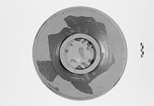 | Description: | Broken around the edges; restored in plaster. Large Western Sigillata plate with heavy base ring. On the floor is a broad band of rouletting and in the center a stamp: <graphic> Buff clay, red glaze. On bottom of foot, unglazed and marked with fingerprints. | |