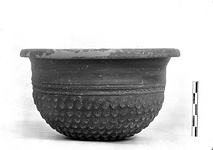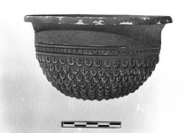 | Description: | Rim rolled out. Row of punches above small imbricated leaves. No rosette on the bottom, but a circle of leaves. Glaze red to black; somewhat peeled. | |