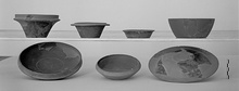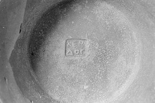 | Description: | Low Samian A bowl with straight sides sloping diagonally out from base to broad rouletted rim. Part of side wall and rim missing. Restored in plaster. Stamp in center of floor: <graphic> Red clay and flaky red glaze. Cf. Iliffe, group 1, "Samian" ware. | |