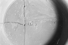 | Description: | Shallow Samian A bowl with outcurved rim. About one-third of floor and side missing. Restored in plaster. Stamp at center of floor; conventionalized tree or leaf. Reddish-orange clay and flaky glaze. | |