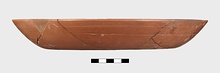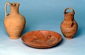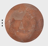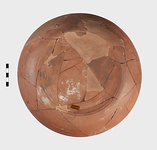 | Description: | Mended from many pieces; fragments of rim and body missing. Plate of typical shape, with steep but not straight sides and plain rim. Red clay and glaze. Surface rather damaged within. Late Roman A Plate. | |