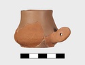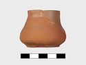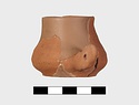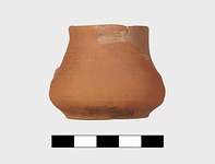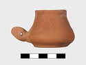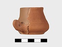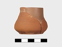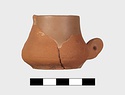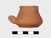 | Description: | Fragments of lip and body missing. Flat bottom, left rough; bulging lower body, narrowing above to plain lip; handle, pierced horizontally, set at point of greatest circumference. Orange-red clay and slip. Blackened inside. | |