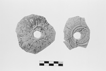 | Description: | Flower and leaf medallion, tiny leaves on wall. Medallion and lower wall preserved. Medallion: nine-petaled rosette enclosed by a leaf band and groove and mutilated by a large hole. Calyx: Covered with tiny ribbed leaves. Clay: Pale to greyish, buff. Glaze: Firm but peeled, fired brown to black inside and out. | |