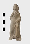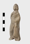 | Description: | Complete save for a chip from the bottom The back is roughly modelled; the bottom open. A youthful female figure stands erect, the right knee out-thrust and slightly flexed. She is clad in a long himation which envelopes the right arm raised across the chest and falls loosely over the left forearm which rests on the abdomen. The hair is gathered into two rolls on top, running back from the brow, and it hangs in loose masses over the breast. Clay: Firm, slightly micaceous, mottled buff to ash grey as a result of fire. Traces of a white engobe remain on flesh, hair and garment. | |