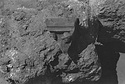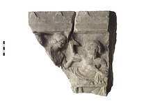 | Description: | A fragment from a grave, or votive, relief. The back is rough-picked; the top edge and surface preserved. The marble has been so stained and damaged by fire that it appears gray on the finished surfaces and pinkish in the breaks. The relief is crowned by a molding consisting of three flat bands, of which the middle one projects and has two antefix-like decorations above it in relief. Below appear the head and shoulders of a female figure, the head in profile facing right, with a downward gaze. Her hair is arranged in a heavy roll round the brows and a large knot at the nape of the neck; she is wearing chiton and himation. Behind her, at the left edge of the fragment, part of the head of another figure, male, also facing to the right. Pleasing subject; undistinguished technique. Pentelic marble. Joins with S 1010 (ΙΙ 257), see photograph in database. | |