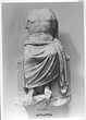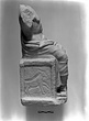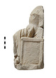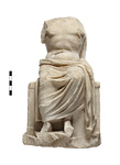 | Description: | Two joining fragments; head and arms missing, minor fractures. The attachment hole for the head, and the lower half of the iron pin in it, preserved on the upper surface of the neck. A male figure draped from the waist down, seated on a rectangular bench. At back drapery carries up over his left shoulder, to fall over his missing left arm. Carved in very low relief on the side of the seat at the figure's right is a goat. Pentelic marble. | |