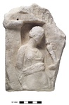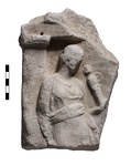 | Description: | From the upper left-hand corner of a small pedimental grave stele; left side rough-picked; back of slab and a bit of top preserved; the surface much worn. A woman leaning against the framing pilaster holds a palladium in her left hand. A small pin hole at top of pilaster. Pentelic marble. | |