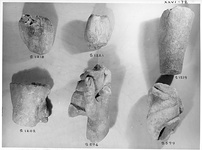 Description:   Forearm preserved from elbow to wrist. Heavily weathered on surface of arm and on break at wrist, comparatively fresh on upper break.