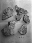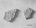| Description: | Fragment of a wing in low relief from a statue of a winged Nike. The thin slab, dressed smooth at the back with a toothed chisel, is broken all around. Part of one large wing feather, and the tip of a smaller one, rounded and overlapping another similar feather, remain. The relief is very low, sharp-edged, and indifferently finished. Pentelic marble. | |