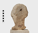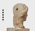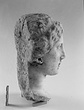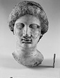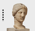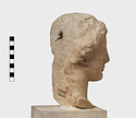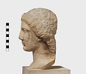 Female head, about half life-size, the hair rolled back from the face and falling to the neck at the left side. Ears pierced for earrings. Flesh surfaces carefully finished. Abundant traces of gilding about mouth and nose, on cheeks, eyes, ears, hair, etc.