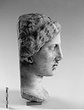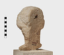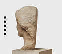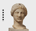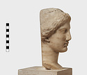 Description:   Complete save minor chips. Cut away flat behind as if for attachment to wall. An iron dowel passing from the crown of the head diagonally out to the flat surface has split the marble on the top. Neck finished below for insertion to a statue.