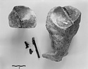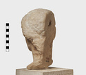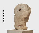 The iron pin set through the top of the head had rusted and cracked the marble. The two pieces were therefore taken apart and the iron pin removed. It proved to be a square bar set in lead in a round drilled hole. The pin was clearly set from the point of the head entering at the back of the headband and running down towards the back at a steep angle. The lower end of the bar as we found it appears to be an original end. It stopped just short of the flattened back of the marble. The upper end apparently projected from the head and had been broken off in antiquity (H. A. Thompson, 1 May 1954).