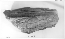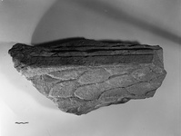 | Description: | The fragment comes from near the bottom of the proper right corner, preserving a little of the snaky body and a little of the lateral molding on the back of the pier. Both body and molding were left rough toward the bottom where they were not ordinarily visible. Pentelic marble. | |