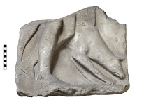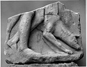 | Description: | Lower part preserved, broken at top only. From narrow relief; legs of a man, half life-size, walking toward the right; behind him a dog, nose to ground; end of garment in front of man's left knee. Left side undercut as for insertion. Two vertical small holes in top surface. Pentelic marble. | |