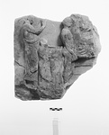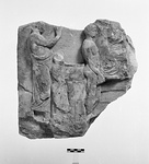 From left to right, a bearded man in himation, his right arm raised; a child in himation; a large lebes standing on a tripod; a nude youth carrying a jug (?) in his right hand; the body of a large seated figure to right, probably a goddess.