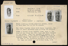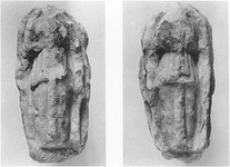| Description: | Heads missing; bottom somewhat broken, seems to have been cut to fit in socket. The three figures stand with backs together, the line of their extended arms holding out drapery which forms a double frame between them, save in the case of one which has the right arm bent sharply at the elbow. They are dressed in peplum with overfall girt at the waist and hanging below in regular folds. The skirt is done in the style if some of the Acropolis maidens, clinging to the legs and drawn out on either side, with bunched folds hanging down the middle. Indifferent work, much battered. Pentelic marble. | |