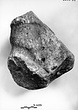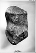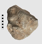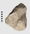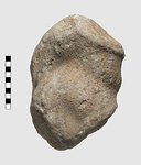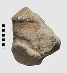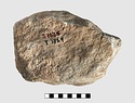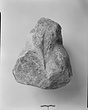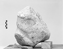 | Description: | From mid part of nude male figure, apparently in the round. Right leg held up, or forward as is seated. Small hole for peg just to left of broken right leg. Much weathered, especially at front. Island marble. | |