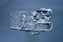 | Description: | Molding broken away above, but the relief itself is essentially complete. Marble sugary from proximity to fire. A hero reclines on a couch, holding up a cornucopia. A woman sits beside the couch holding a bowl. A child approaches from the left. Back rough-picked. Pentelic marble. | |