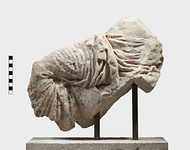 | Description: | Broken all around. Lower body and legs of a male (?) figure in himation seated on a rock facing left. Part of fragment eroded (both worked and broken surfaces) as if by cesspool. Good Periclean work. Cf. Altar of Ares series. Pentelic marble. | |