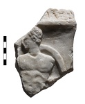 | Description: | Upper right corner preserved. Head and torso of a youth carrying a shield. He stands facing, looking left, the shield behind his left shoulder. Upper edge roughly dressed as if crowning molding had been added separately. Back rough-picked. Pentelic marble. | |