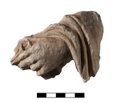 | Description: | Small left hand. Back surface at break. The hand grasps some indistinguishable object (sistrum?), holding it against garment, part of which falls over the wrist. Rasp finished. Same scale as S 192 (E 145). Pentelic marble. ADDENDA The two pieces go together, part of same grave relief of Isis. | |