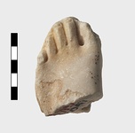 Description:   A left foot wearing sandal, broken of through instep. End of big toe broken. Heavy weathering on proper left side next to break.