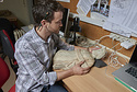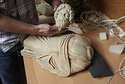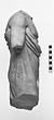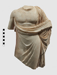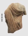 | Description: | Draped male figure (Asklepios), about one-third life-size, wearing himation which frames chest, falls lightly over legs and heavily over left arm and down left side. Right arm broken at biceps. Stub of staff preserved under right arm. Traces of bright red paint preserved on right side and back of garment and in folds. Burnt traces on left edge. White marble. Mended with S 1067. | |
