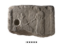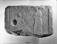 | Description: | Broken top and bottom. Socket for door pivot in front face. Low relief. Woman seated to right clasps hand of man standing in front of her; behind her small standing female figure. Low pilaster on either side. Pentelic marble. | |