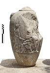 | Description: | Foot, neck and handles missing and a large chunk broken out of right side of body. Much worn. In relief four figures. Standing man shaking hands with seated woman, behind each, a small standing figure. White marble. | |