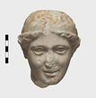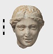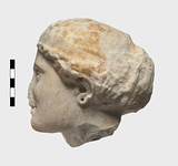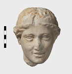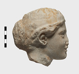 | Description: | Broken at neck. Part of nose missing. Small chips from lips and chin missing. Head slightly tilted to her right. Lips parted in smile with teeth showing. Holes in earlobes for earrings. Hair parted at center and gathered at nape of neck. Fillet binds hair. Top surface of head much weathered. Temple of Ares Frieze. Pentelic marble. | |