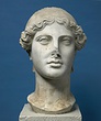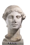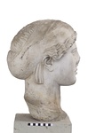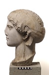 | Description: | Intact except for end of nose, chips from ears and upper eyelids, chips from just above left ear. Left side stained brown. Made to be set into a shaft; the bottom is approximately the frustrum of a cone. Rounded face, full bow lips slightly parted, long straight nose, upper eyelids overlie lower ones at corners. Well defined brows. Hair parted in center, pulled back in waves over ears, held in place by headband wrapped three times around head, the ends of which falls down behind ears. Headband very sketchily done and not well defined. Two round dowel holes in bottom for attachment. Fine workmanship, surface very fresh. Pentelic marble, greenish fault along left side. Derived from Nike of Paionios. Cf. "Hertz Head" in Richter (1929), Sculpture and Sculptors of the Greeks, fig. 639 (p. 187 and figs. 684-685 in fourth edition 1970); Kaschnitz-Weinberg (1936-1937), Sculturaedel Magazzino del Museo Vaticano, no, 47, pl. XV. | |
