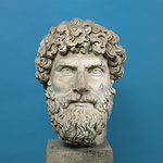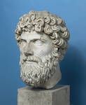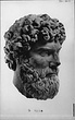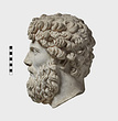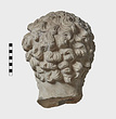 | Description: | Broken at neck. Head intact except for tip of nose and chips and wear on hair. Fault in marble near top of head. Portrait of middle-aged man with bushy beard and masses of curly hair on head and neck, leaving the lower half of ears visible. Hair of eyebrows indicated. Prominent furrowed brow. Engraved irises and drilled pupils. Free use of drill on hair and beard. Perhaps a portrait of a kosmete. Good white Pentelic marble. | |