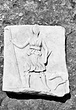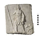| Description: | Rough-picked at back and all four edges, as though cut down and reused from a larger piece. Face of Artemis broken away. Artemis, facing out but moving left, wears chiton with overfold and thick, twisted belt and hunting boots. Long torch held in right hand, possibly bow in left. Quiver visible over right shoulder. Dog with collar to her left, also moving left. White marble. Hesperia 86 (2017), p. 303, n. 60. | |