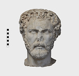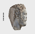 | Description: | Broken at neck; nose and a large area of back of head missing. Chips missing from curls of hair. Portrait of a bearded male, wearing a wreath of maybe laurel. Furrowed brow; drilled eyeballs, looking up. Mustache, eyebrows, edges of hair on forehead, and most of beard done with heavy wavy incisions. Center of beard on cheeks and hair on top of head incised as curls. Hair forward of wreath done as heavily incised and drilled curls. White crystalline marble. | |