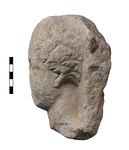 Female head turned slightly to her right. A bit of the relief background preserved at right. Chubby face with heavy eyelids. Ear only summarily worked out. Two Venus rings on neck.