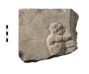 | Description: | Upper left hand corner of relief plaque. Upper torso and head of a nude male figure, his arms stretched straight out in front, perhaps boxing. Figure, particularly head, battered and worn. Back very roughly worked. White crystalline marble. | |
