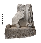 | Description: | Rough-picked back surface and bottom preserved; at the back, the lowest 0.10m. is cut back for a depth of ca. 0.045m., as if for setting in a base. Two sandaled feet are preserved to the left, to the right, the lower leg and right foot of a figure wearing a long chiton. Pentelic marble. Cf. S 259 (Η 40). | |