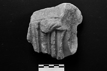 | Description: | Fragment of right shoulder covered by Isis shawl (four narrow folds preserved), one long lock curled on shoulder and narrow arc of smooth-surface of flesh at neck, are preserved. No drilling of lock of hair. Rasped finish to shawl, the folds of which vary in width and depth. Line of drill along top of shoulder separated relief of figure from slab of background. Narrow wedge of background, all broken, remains. Pentelic marble. Period of Trajan. | |