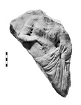 | Description: | Broken all around. Head missing. Relief, perhaps votive, of female figure, maybe Aphrodite. She wears chiton and himation; chiton has slipped below her right shoulder. Her left hand wrapped in the cloth and propped on her left hip. Her right elbow was propped on a now missing support. Pentelic marble. | |